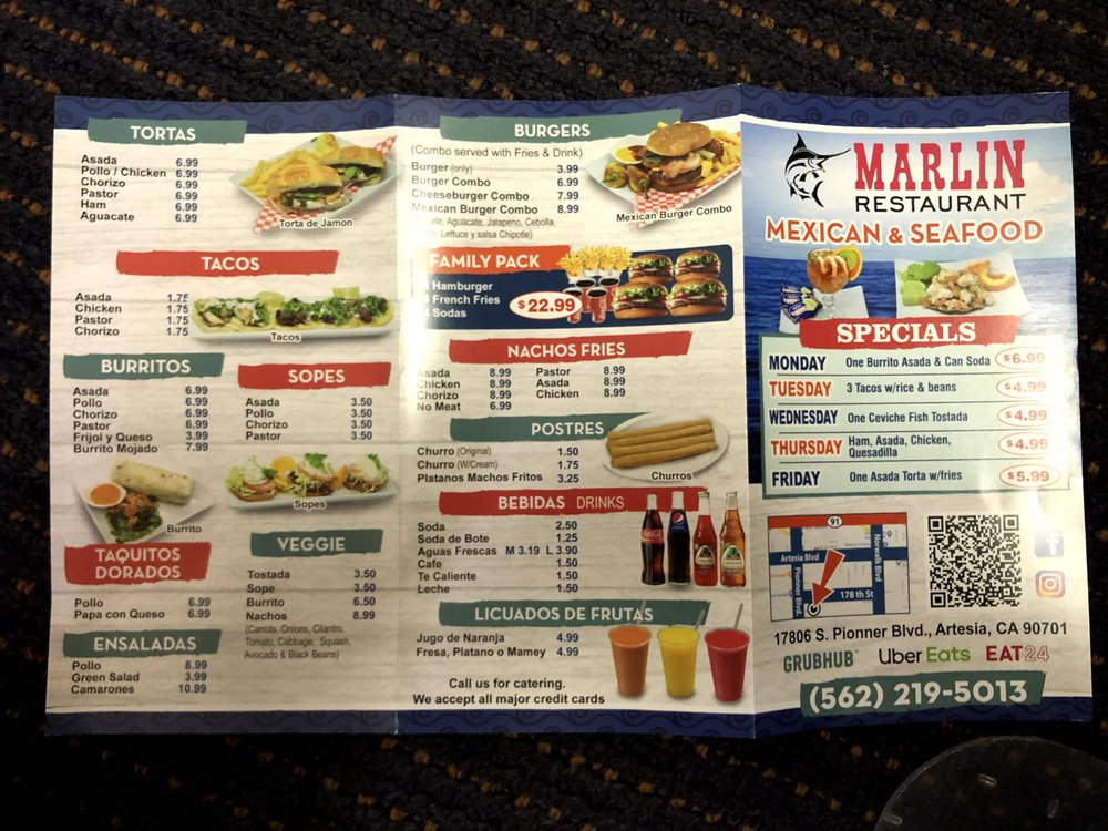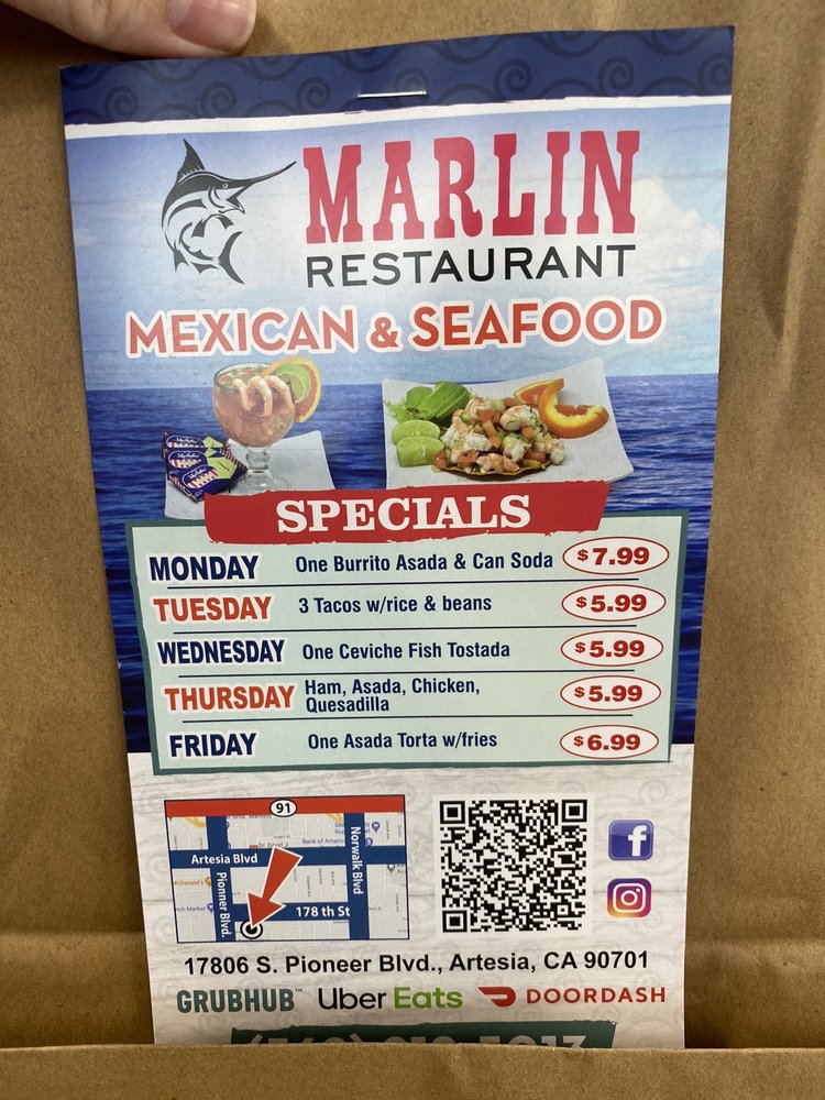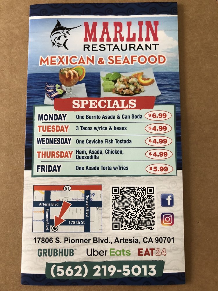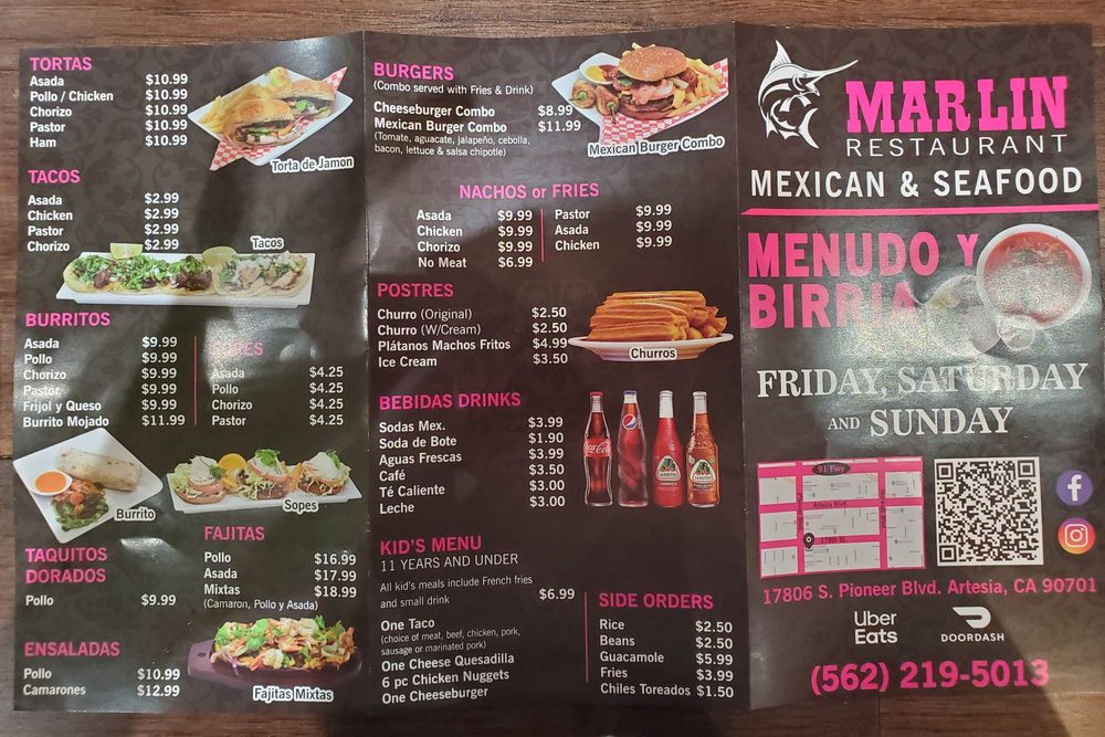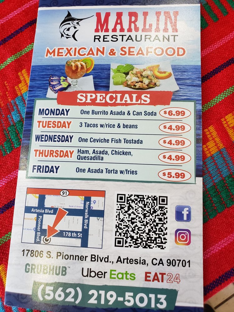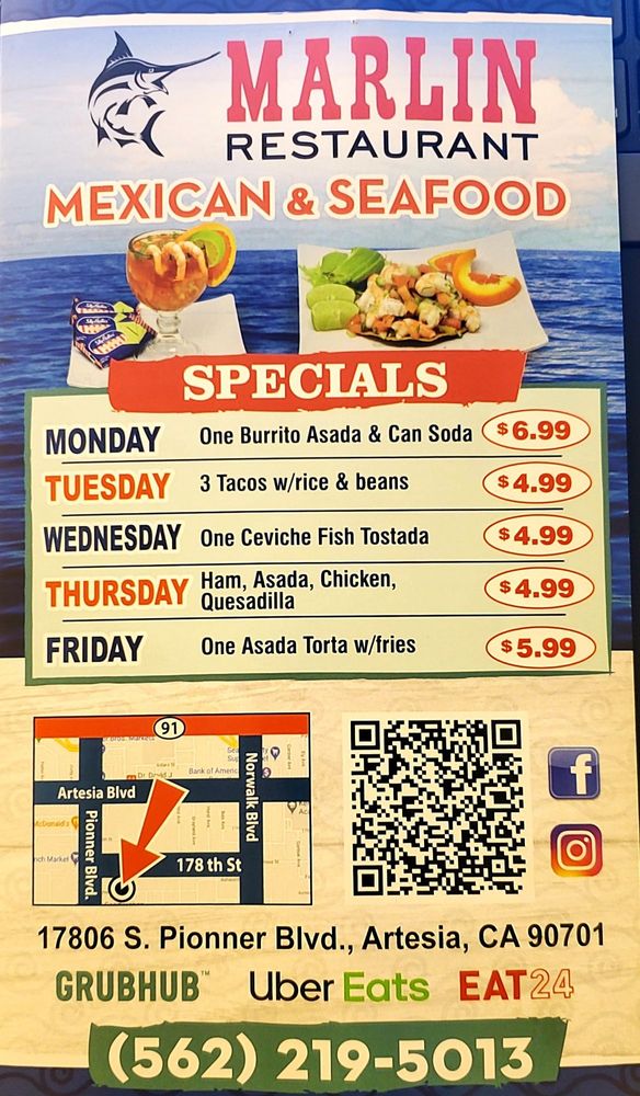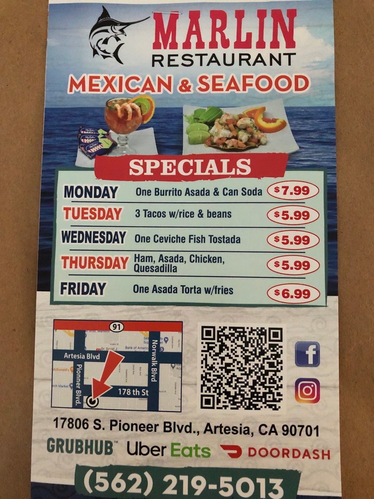 Marlin Restaurant in Artesia, CA, offers a fusion of Mexican and seafood cuisine, providing delivery and takeout options. Despite some mixed reviews on portion sizes and pricing, customers rave about the flavorful dishes like Tacos Gobernador, Shrimp Tacos, and Ceviche de Camaron. The cozy atmosphere and friendly staff have won over patrons, with some hailing it as their go-to spot for Mexican food. While there are minor issues with packaging and pricing, the overall consensus is positive, highlighting the delicious food and attentive service. With a nice wine selection and quick service, Marlin Restaurant aims to provide a satisfying dining experience for seafood and Mexican food enthusiasts.