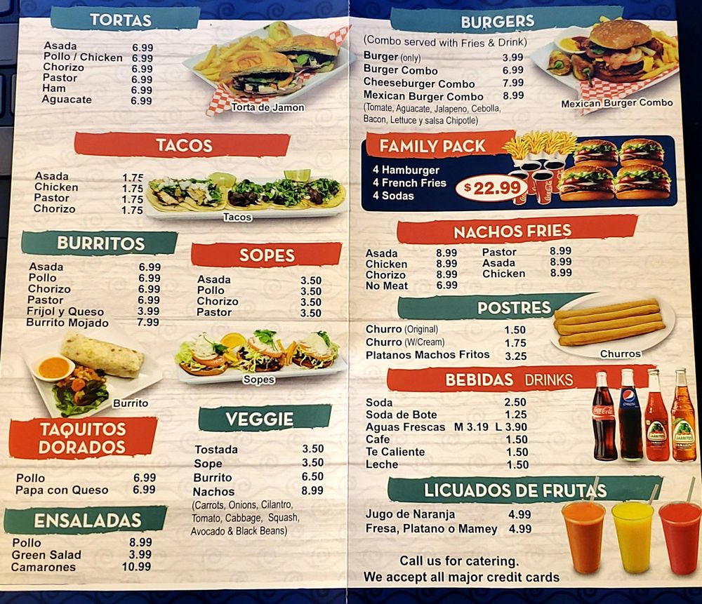 Includes beans, meat, lettuce, cheese, onions, jalapeños, avocado, and tomato